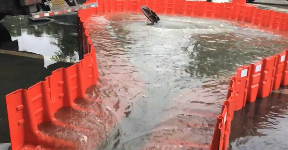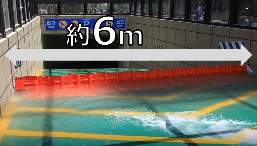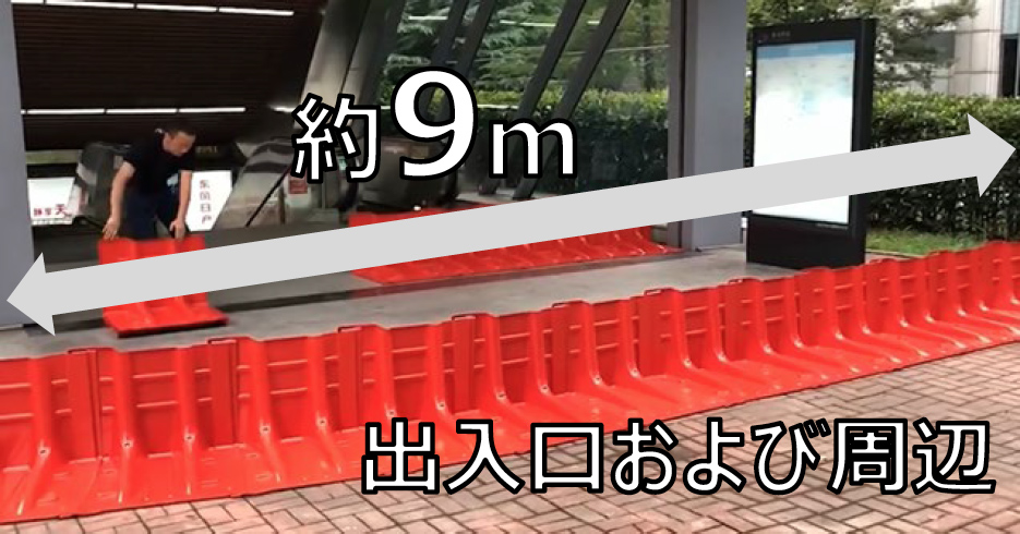 施設玄関口や地下駐車場出入口等の屋外エリアで、地面に置くだけで集中豪雨や洪水から守る水害対策商品です。
