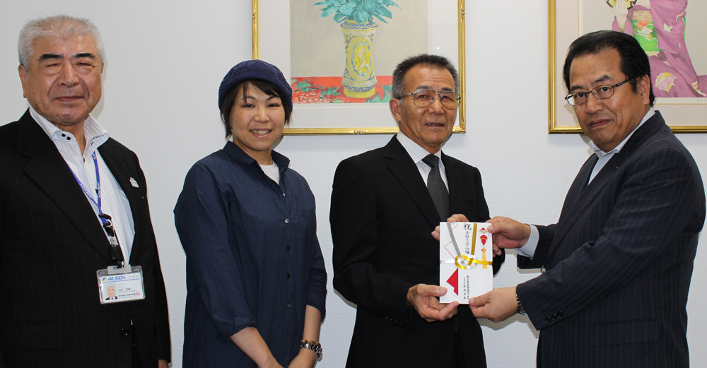 8月3日に「ALSOK鹿児島 ALL WAVE」の代表者が弊社を訪れ、武田専務取締役から激励と金一封の贈呈をいたしました。