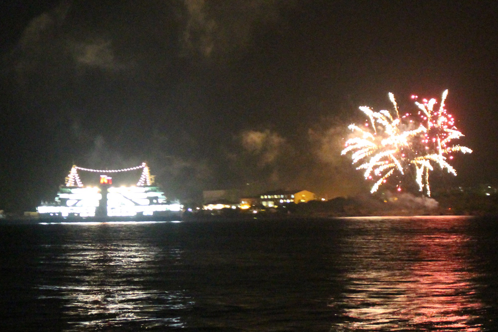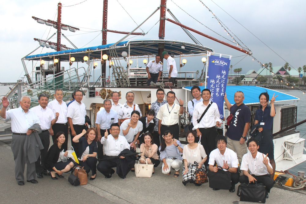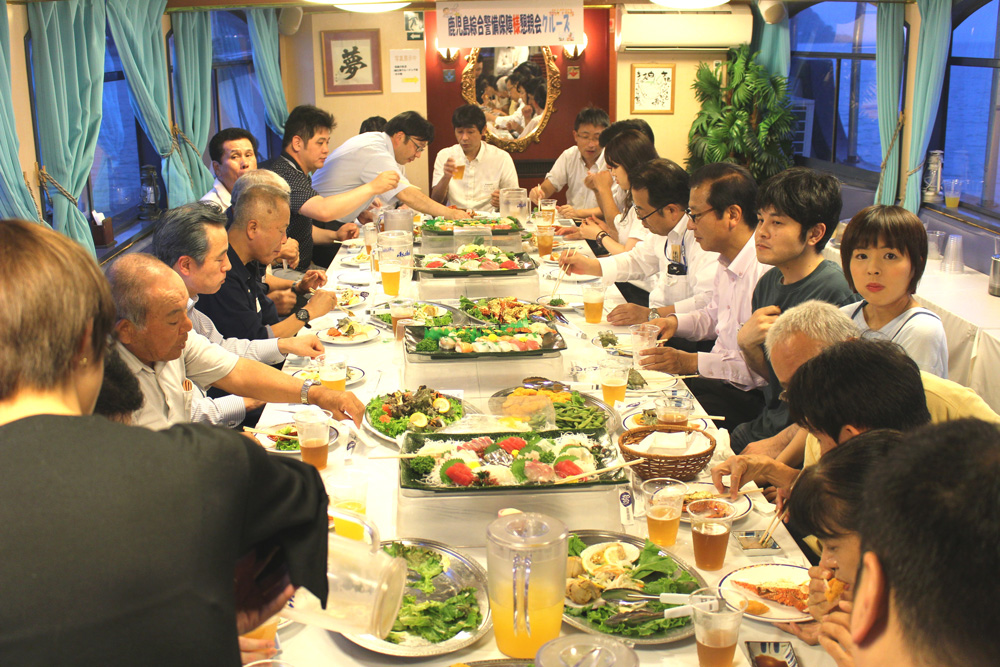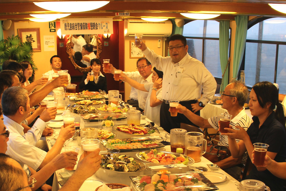 錦江湾を約2時間かけてクルージングし、桜島や鹿児島市街地の夜景、水中花火を眺めながら、大人から子供まで合計約200人が食事と仲間たちとの交流を楽しみました。