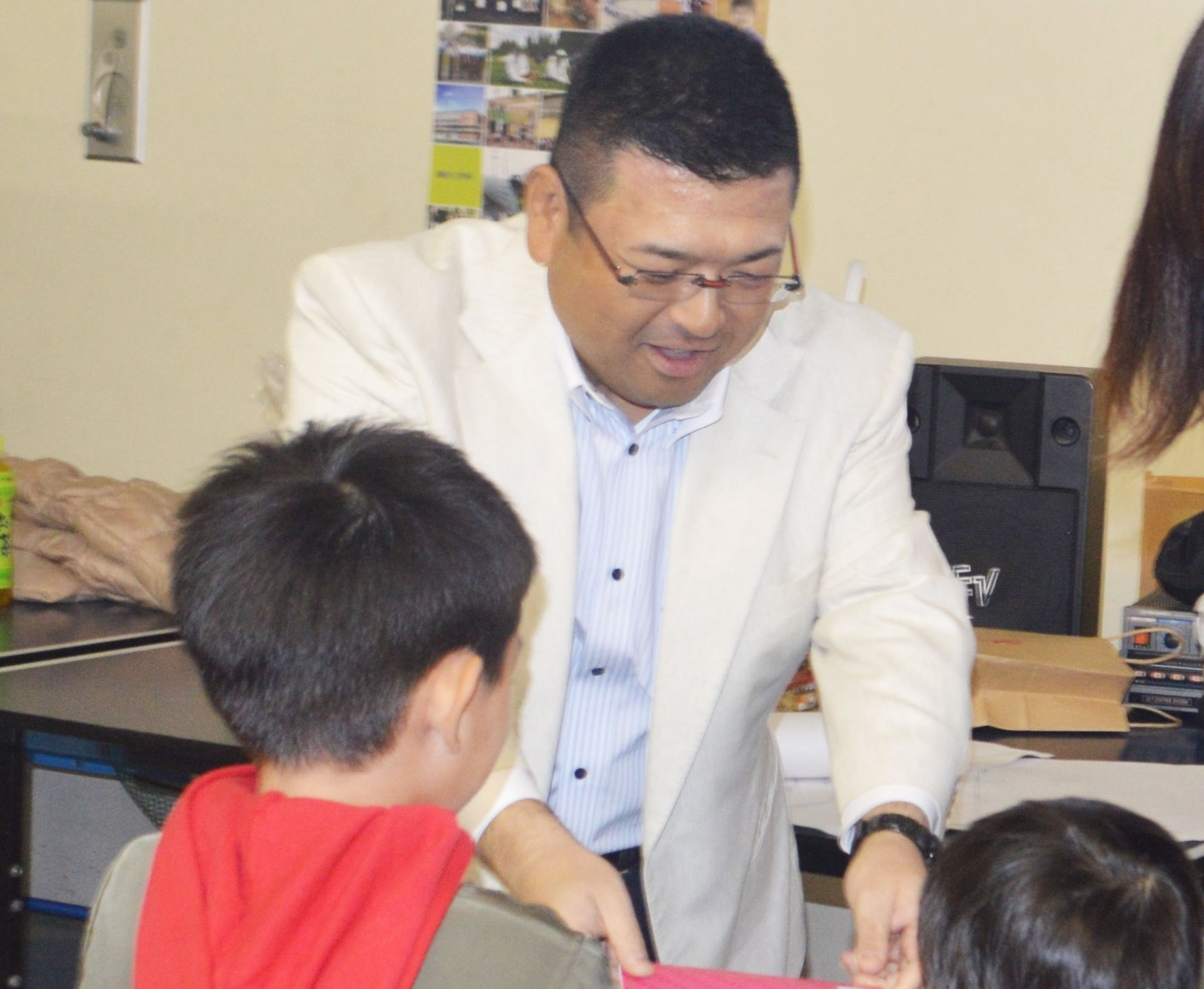 ボウリング大会表彰式で荒武社長から景品を受け取った従業員や家族、そして子供達は、笑顔でいっぱいでした。