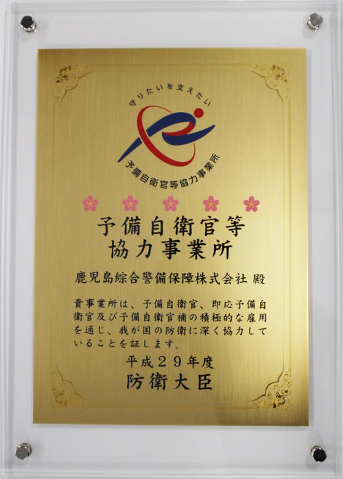 平成30年2月26日(月)、弊社は「予備自衛官等協力事業所」として、防衛大臣より認定されました。