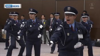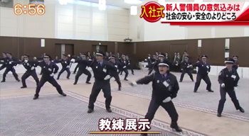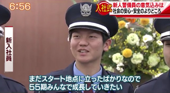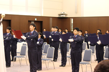 一週間の入社前研修を経て、晴れて警備士となった新入社員23名が、誓いの言葉を述べ、警戒棒の操作や敬礼などの基本動作を披露しました。