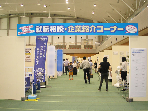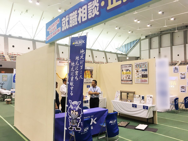 このイベントは、プログラミング体験や高所作業車への試乗等、体験を通じて様々な仕事の魅力を紹介したり、学生やその保護者など地元への就職を考えている方へ、就職相談等の場を設けたイベントであり、弊社は、ホームセキュリティや防犯グッズ等の商品紹介と、あわせて求人情報の紹介を行うブースを出展しました。