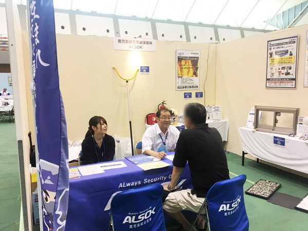 夏休み期間中だったこともあり、たくさんの家族連れの方が来場され、弊社のブースにも多くの方が興味をもってくださり、ご自宅での防犯に関するお困りごとや心配ごと、就職に関するご相談などについてお話をさせていただきました。