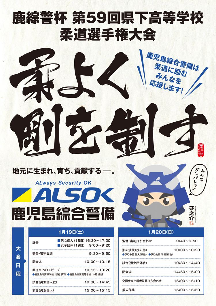 平成31年1月19日(土)(個人戦 10:00~15:15)20日(日)(団体戦 10:00~15:00)の2日間 鹿児島アリーナ(サブアリーナ)会場にて当社が共催を務める鹿綜警杯 第59回県下高等学校柔道選手権大会が開催されます。
