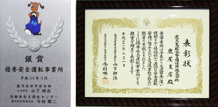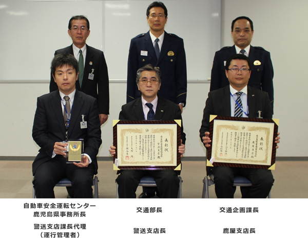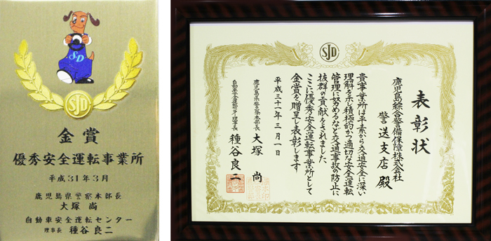 平成31年3月1日(金)、鹿児島県警察本部において、「優秀安全運転事業所表彰式」が行われ、警送支店が『金賞』、鹿屋支店が『銀賞』を受賞しました。