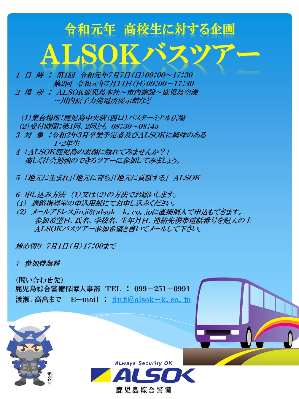 「ALSOKという名前は聞いたことがあるけど、どんな場所でどんな仕事をしているのか知らない。」「地元鹿児島の安全・安心を守る仕事に興味がある!」という方がいましたら、お一人でも大歓迎ですので、ぜひこの機会に申し込みをお願いします。