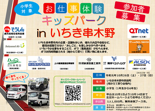 2019年10月26日(土)・27日(日)、「お仕事体験 キッズパーク in いちき串木野」が開催されます。いちき串木野市内の企業・店舗をはじめ、憧れのお店や会社など、普段は経験できない「おしごと」を子どもたちが楽しみながら学べます。