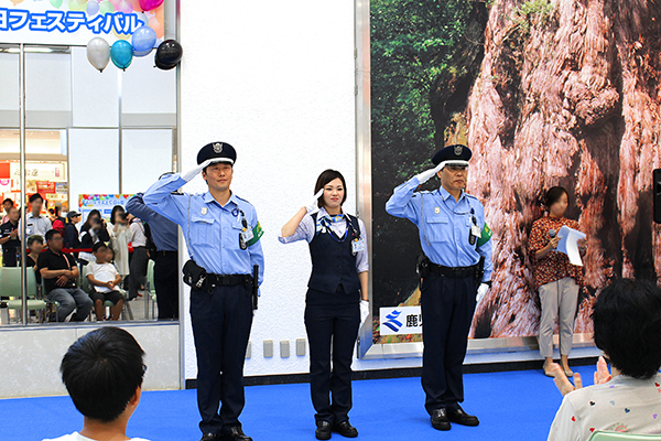 たくさんのお客様に見守られながら、3名のALSOK鹿児島綜合警備職員が、キレのある掛け声で登場した後、イベント司会者からの質問形式で、普段の空港内でのお仕事内容や、業務上での嬉しかったエピソードなどを交えてお話ししました。