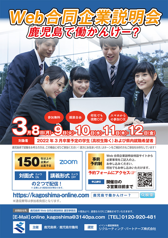 2021年3月8日~12日、オンライン会議システム「Zoom」を使用した鹿児島県主催「Web合同企業説明会」が開催されます。