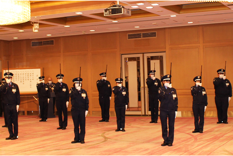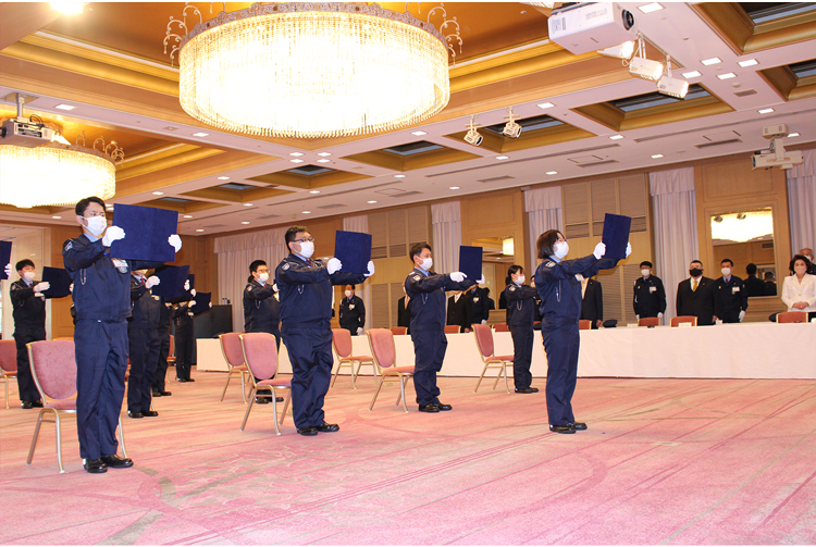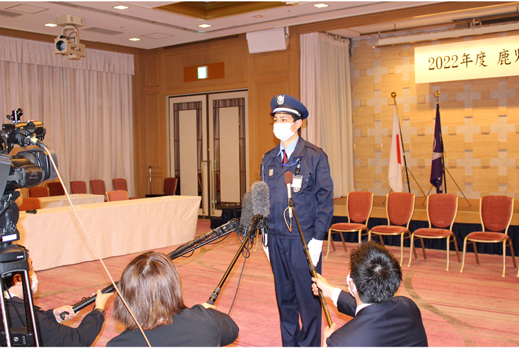 今年度は18名の新入社員が1週間の研修を終えて、ALSOK鹿児島綜合警備の仲間となりました。入社式では辞令交付を受けたあと誓いの言葉を述べ、研修で鍛えた警戒棒の操作や敬礼などの基本動作を披露しました。終了後、テレビ局や新聞社の取材を受け、「自覚と責任をもって頑張っていきたい」と社会人としての抱負を述べました。