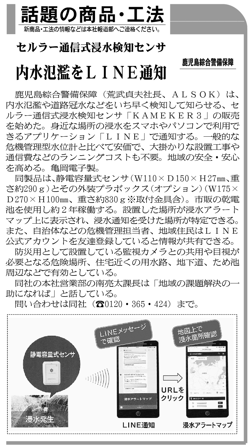 2022年7月23日付の鹿児島建設新聞において「話題の商品・工法」コーナーに当社が取り扱っている「KAMEKER3」が取り上げられました。
